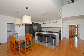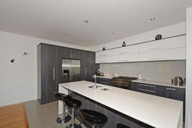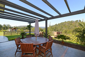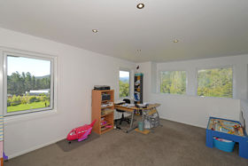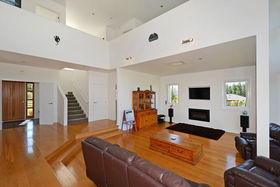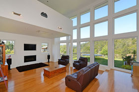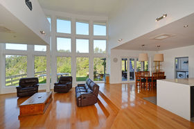 Designer windows span the length and height of the impressive two story living space. With a mezzanine balcony it enhances the beautiful vista over the valley to the native trees, while also allowing light and sun to flow freely through the home.