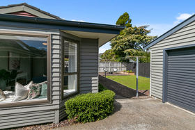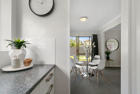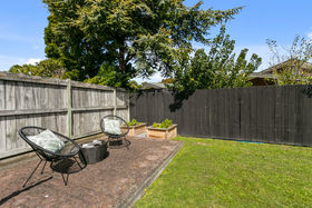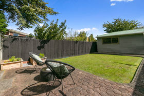 Doors open to a low maintenance, sunny garden with veges boxes.